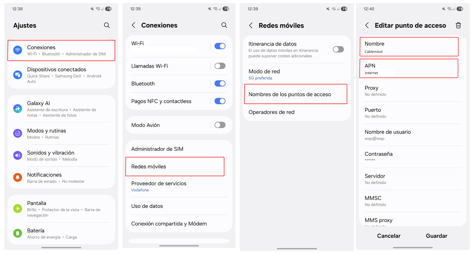 - Accede a “Ajustes” > “Conexiones inalámbricas/redes” > “Redes Móviles” > “APN” > “Nuevo APN”